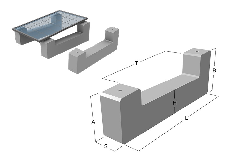 Elemento di supporto a zavorra per l'ancoraggio di moduli fotovoltaici su coperture piane o terreni battuti. Realizzato in calcestruzzo è dotato di fori laterali per la movimentazione e predisposizioni per il fissaggio del modulo senza forature.