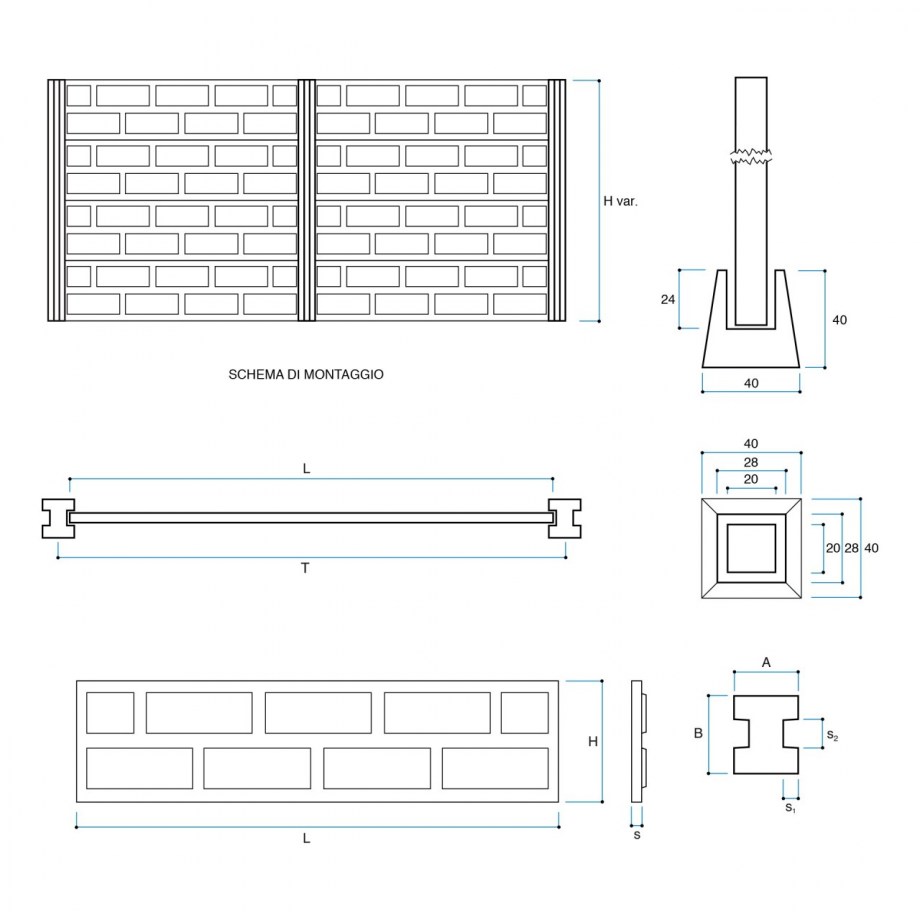 - pilastrino in c.a.v. di sezione 13x16 cm ed altezza variabile fino ad una massimo di 300 cm, con asole laterali per l'inserimento dei pannelli prefabbricati, da porsi in opera annegato nell'apposito plinto di fondazione;