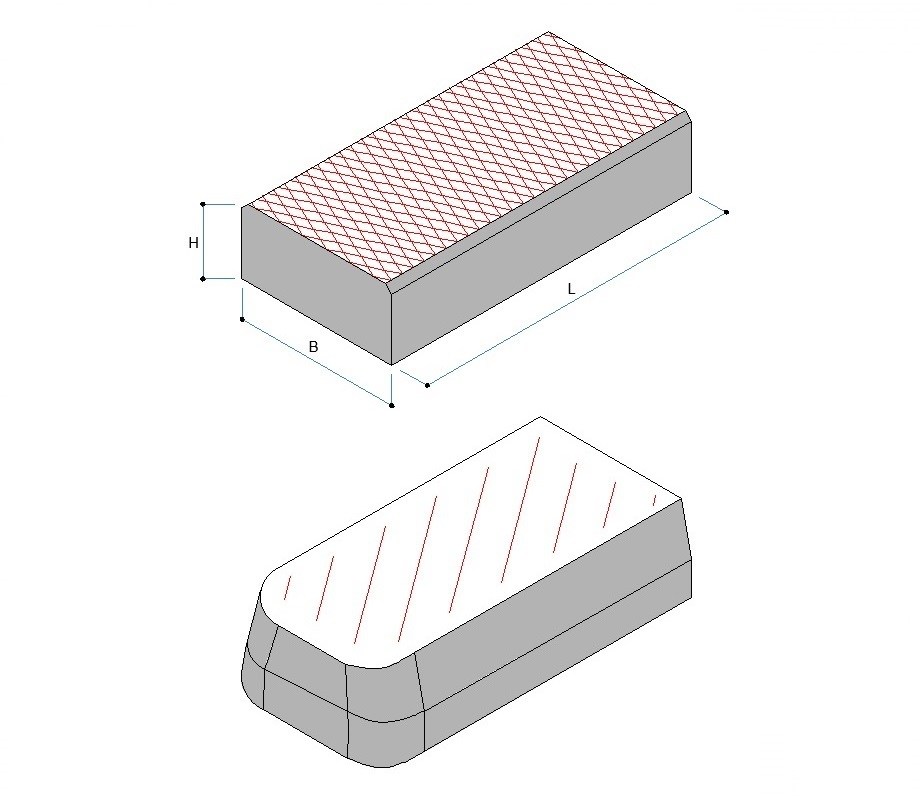 Cordoli stradali di tipo speciale a sezione rettangolare o trapezoidale, realizzati in calcestruzzo vibrocompresso e dotati di superficie antiscivolo con disegno rispettivamente grigliato e rigato.