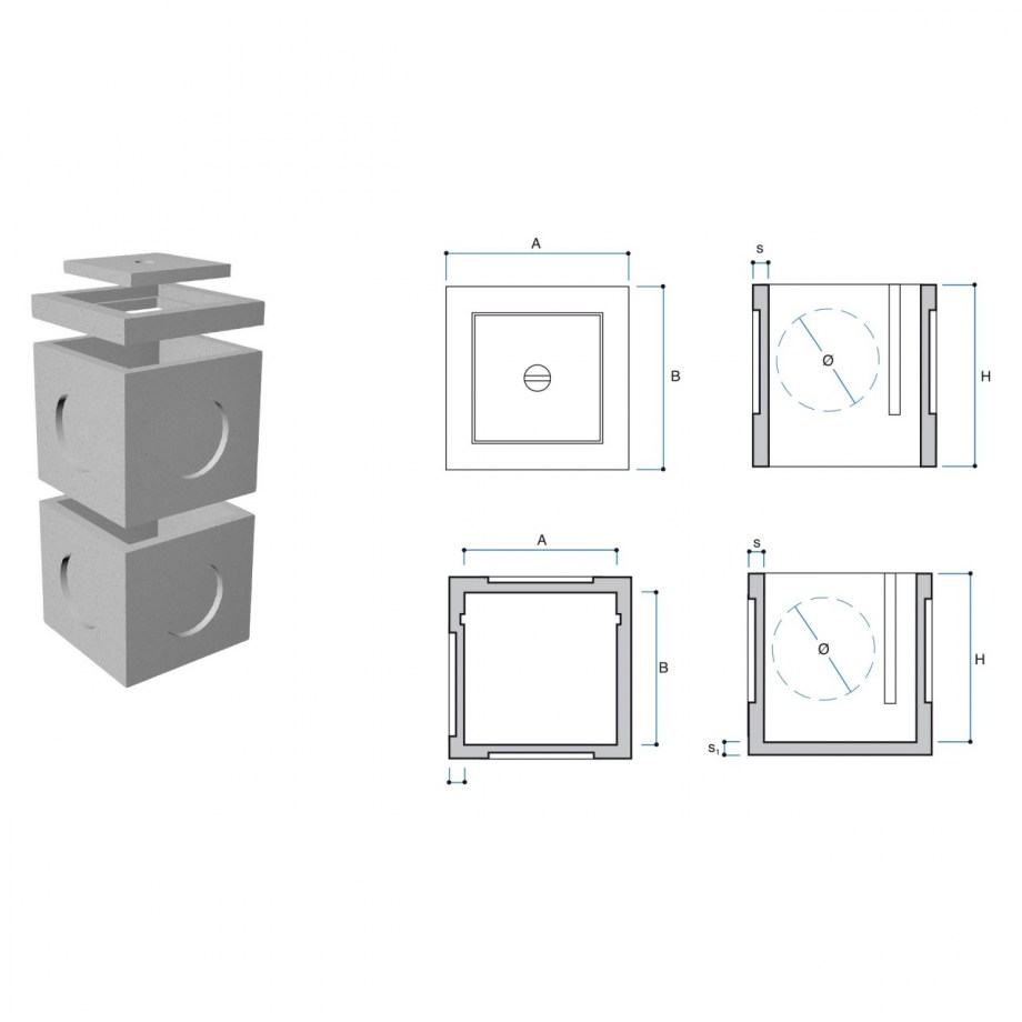 Pozzetto realizzato con elementi prefabbricati in calcestruzzo vibrato, munito di impronte laterali per l'inserimento dei tubi e completo di chiusino pedonabile.