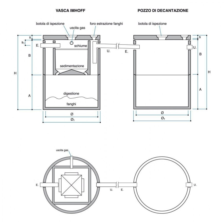 Impianto di trattamento acque reflue costituito da vasca primaria Imhoff e successivo pozzo di decantazione, realizzati entrambi con elementi prefabbricati in c.a.v. da posizionare in opera e sigillare adeguatamente per garantirne la perfetta tenuta idraulica.