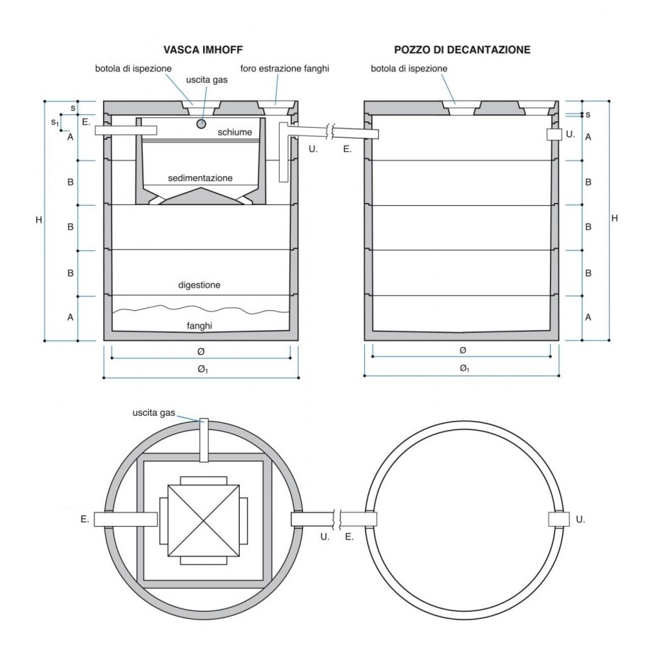 Impianto di trattamento acque reflue costituito da vasca primaria Imhoff e successivo pozzo di decantazione, realizzati entrambi con elementi prefabbricati in c.a.v. da posizionare in opera e sigillare adeguatamente per garantirne la perfetta tenuta idraulica.