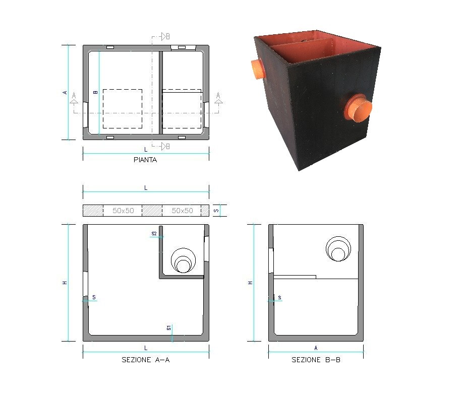 Scolmatore di prima pioggia, costituito da vasca monolitica prefabbricata, realizzato in calcestruzzo armato vibrato ad alta resistenza con finitura liscia da f.c. metallico, idoneo per la separazione per gravità senza accumulo delle acque meteoriche di prima pioggia.